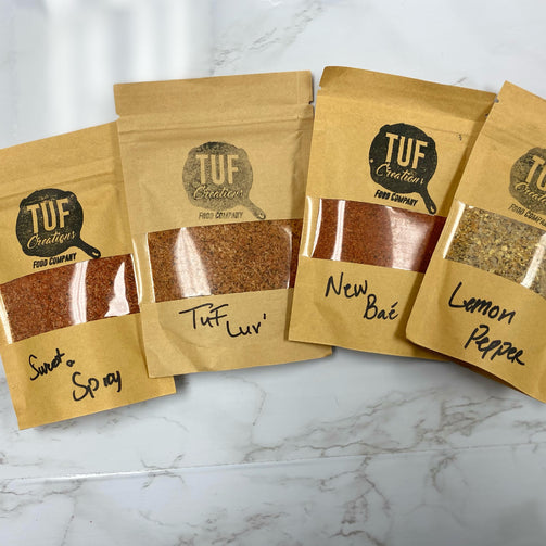All 4 of the Original Spice blends. ( Sweet and Spicy, Tuf Luv’, Lemon Pepper, New Bae) You can use these for any dish from beef to seafood.